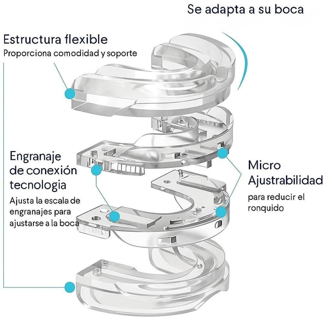 El dispositivo ajusta suavemente la mandíbula para mantener las vías respiratorias abiertas, evitando vibraciones que causan el ronquido. Así, respiras mejor y duermes más tranquilo.